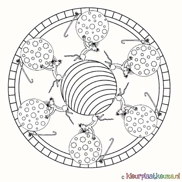 Kerstmandala met versiering en muizen kleurplaat