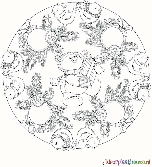 Mandala kerst Ornament vogels en teddybeer kleurplaat